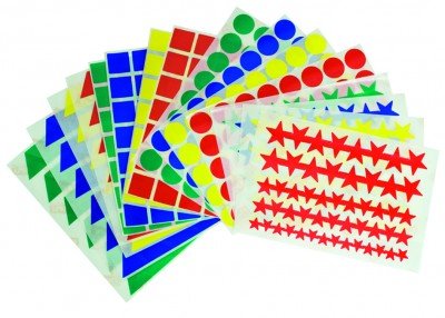 • Pegatinas: con unos llamativos gomets podemos inventar mil cosas para que trabajen tanto despegándolas como pegándolas siguiendo determinadas formas. Podemos pintar una manzana y que ellos vayan pegando por el contorno unas bonitas pegatinas verdes ;).