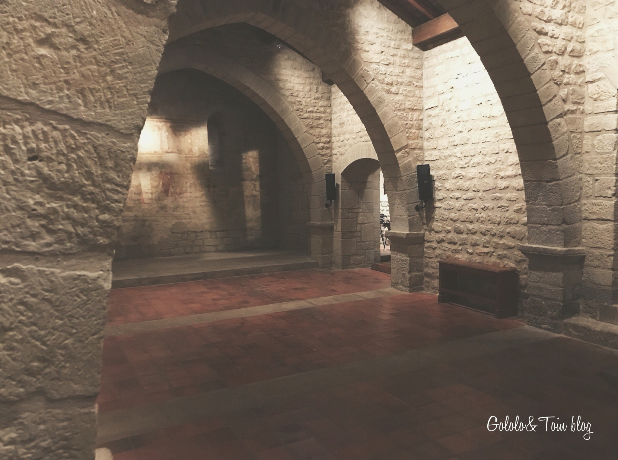 La zona de la izquierda del palacio está unida a él, desde el siglo XV, a la antigua iglesia de San Martín, una bonita capilla románico-gótica del siglo XIII. En sus paredes se pueden apreciar pinturas que representan pasajes de la vida de San Martín. En esta zona pudimos ver una proyección sobre la evolución de Sos del Rey Católico, los peques se sentaron en el suelo para disfrutar del vídeo y así descansaron un poquito :).